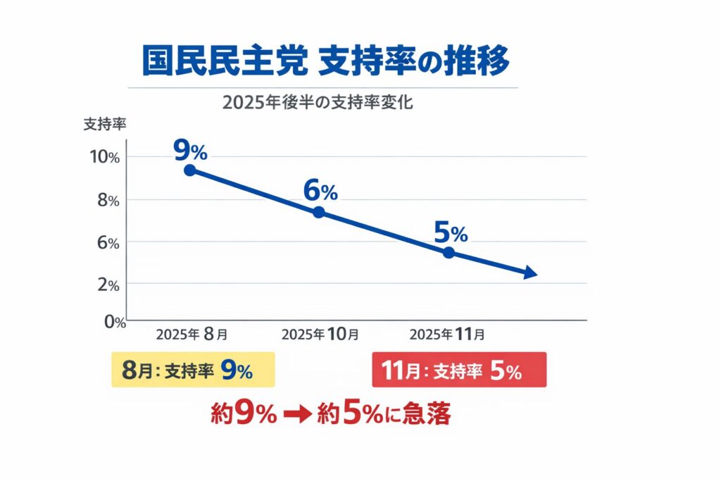 複数の報道によると、国民民主党の支持率は2025年の後半に入り、顕著に低下しました。
