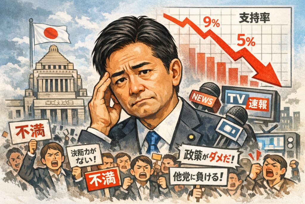 - 2025年10月調査で 支持率が約9%→5% に低下したという報道がある。